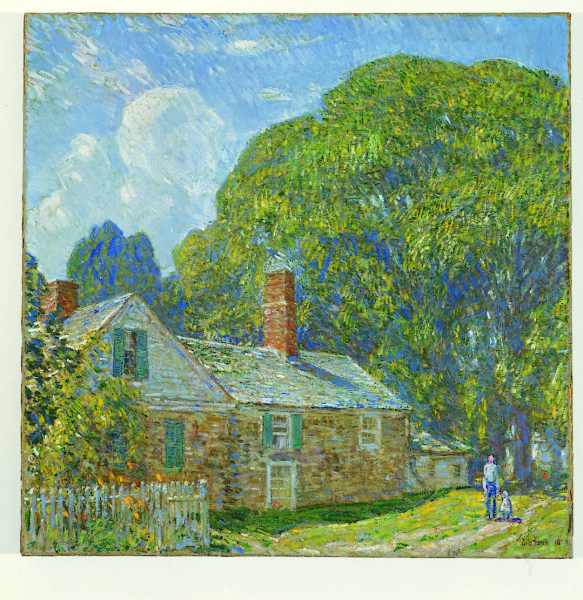 Along with Theodore Robinson and William Merritt Chase, Childe Hassam is regarded as one of America’s most important Impressionists. Hassam was a leading member of a group of artists known as The Ten, who began exhibiting together in 1898 to protest the conservatism of the jury at the National Academy of Design’s annual exhibitions: an act that mirrored the Impressionists’ rejection of the annual Paris Salon more than a quarter-century earlier. Here, Hassam depicts a house in Old Lyme, Connecticut: a town that became a popular summer colony for artists in the opening years of the 20th century. Hassam was one of the first painters to work there; in fact, he completed "The Stone Cottage" during his first visit to Old Lyme in 1903. His comfort with the style, in which he had been working for almost two decades by this point, is evident in his confident use of light, feathery brushwork, his airy palette of blues and greens, and his use of patches of unprimed canvas to describe the earthy tones of the cottage’s stone walls.