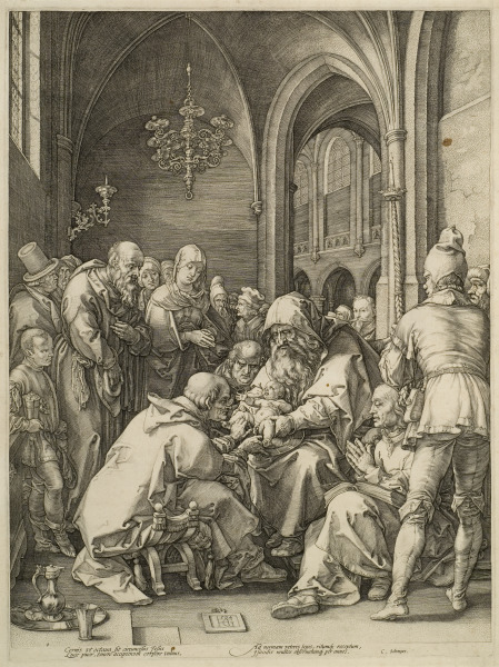 This engraving is from a series entitled The Life of the Virgin that Goltzius engraved in 1593-1594. Each image was intentionally rendered in the style of a different artist; this particular work is in imitation of the great German artist Albrecht Dürer. Goltzius' mastery of the engraving technique is seen in his fine tonal qualities achieved by alteration of the thick and thin lines. His abilities as an engraver are perhaps even more remarkable as his right hand was crippled early in his life.