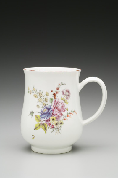 The naturalistically depicted flowers on this mug were inspired by a style known as deutsche Blumen (German flowers), similarly naturalistic floral decoration that the Meissen factory in Germany used to decorate its porcelain from the early 1740s.