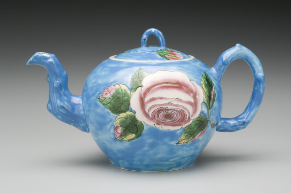 Colored enamel grounds, such as the turquoise that covers most of this teapot’s surface, were a popular form of decoration on salt-glazed table wares made in Staffordshire in the 1760s. They were probably inspired by contemporaneous porcelain examples from the Sèvres manufactory in France.
