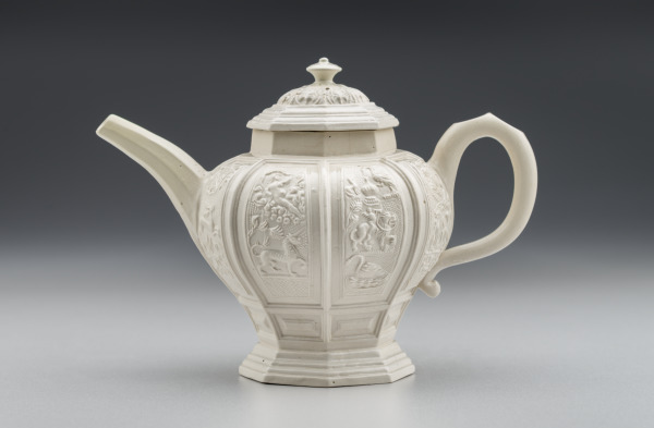 Among the fantastic figures, animals, and heraldic symbols stacked one upon another on this teapot is a depiction of Aesop’s story of a fox and a crane. Aesop is believed to have lived in ancient Greece between 620 and 560 BCE and is credited with numerous tales now collectively known as Aesop’s Fables.