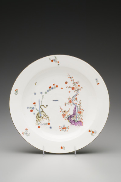 This dish’s painted decoration, which features a tiger with bamboo and a prunus shrub, was inspired by a Japanese porcelain pattern. The dish belonged to a service once displayed by Augustus the Strong at his Japanese Palace in Dresden.
