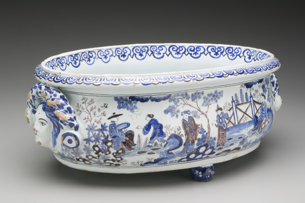 This large basin was used to chill wine or liqueur bottles, or possibly in conjunction with a wall fountain. It was made in Rouen, where faience, the French term for tin-glazed earthenware, was produced from the early 16th century through the 18th century. The basin’s painted decoration and color palette were inspired by imported Chinese and Japanese ceramics.