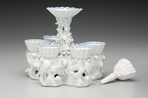 Notice how this stand is molded to suggest a rocky outcropping richly encrusted with seaweed, coral, and various types of shells. Bow specialized in shell-encrusted forms, but this particular version is rare. Only about six are known, and the Mint’s is the only one with under-glaze decoration. The stand’s precise function is unknown, but the removable cups’ pouring lips indicate that they held liquids, perhaps sauces or liqueurs.