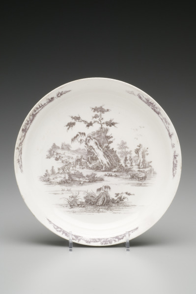The transfer print on this plate was adapted from a larger design attributed to Jean Pillement (French, 1728–1808) and published in Robert Sayer’s The Ladies Amusement, or, Whole Art of Japanning Made Easy (2nd ed., 1762), where it is titled “Chinese Landscape.”