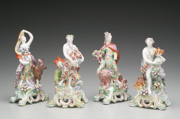 These sculptures depict gods and goddesses from classical mythology as representations of the Four Elements. The female figure with a lion is either Ceres or Cybele and represents “Earth.” The female with an eagle is Juno, or “Air.” Vulcan, holding a cauldron of fiery flames, is “Fire,” and Neptune, with a dolphin, is “Water.”