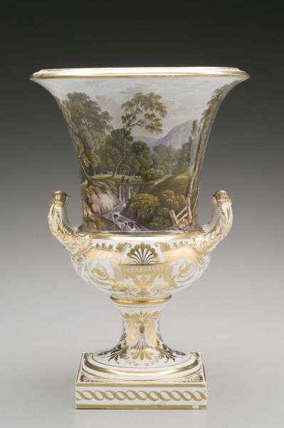 The form of these vases derives from the calyx krater, an ancient Greek vessel with opposing handles set low on a body that resembled the bell-shaped cup, or calyx, of a flower. The vases are painted with continuous views of the English countryside. Such picturesque landscapes became an increasingly popular form of decoration on Derby porcelain from the early 1780s, and the factory employed a number of very talented artists to execute them.