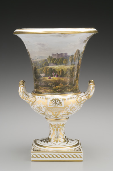 The form of these vases derives from the calyx krater, an ancient Greek vessel with opposing handles set low on a body that resembled the bell-shaped cup, or calyx, of a flower. The vases are painted with continuous views of the English countryside. Such picturesque landscapes became an increasingly popular form of decoration on Derby porcelain from the early 1780s, and the factory employed a number of very talented artists to execute them.