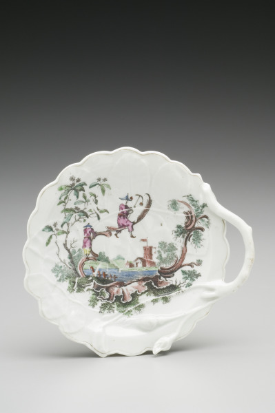 Notice how this dish has two forms of decoration that bear no relationship to each other. The first is the raised surface pattern of rosebuds and leaves, known as the “Blind Earl” pattern. The second design is the transfer-printed scene known as Les Garçons Chinois (The Chinese Boys), attributed to Robert Hancock (English, 1728–1808), after a design in the style of Jean Pillement (French, 1728–1808).