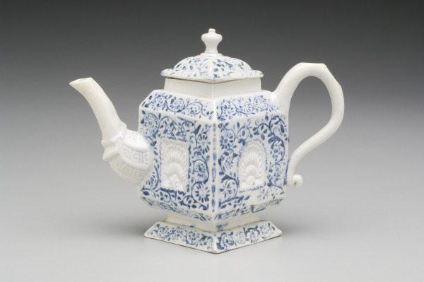 The blue on this teapot is a particular type of cobalt decoration known today as “scratch-blue.” In this technique, the craftsman incised, or “scratched,” the pattern into the object’s surface with a sharp pointed tool, filled it in with cobalt powder or slip, and then scraped away the surplus cobalt.