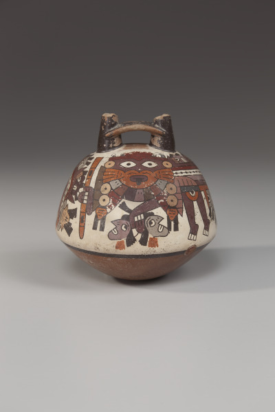 This ceremonial vessel is adorned with the image of a Nasca warrior. He wields a baton-like weapon in his right hand and clutches two trophy heads in the other. His high status is implied by his gold feline whisker nose ornament that transforms him into a powerful jaguar-warrior.