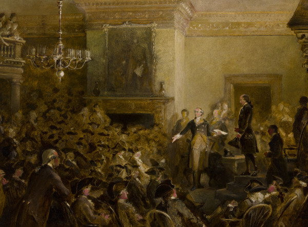 This painting, and the one hanging adjacent to it, speak to America’s fascination with its past, and in particular, with its leaders from the Colonial era, such as George Washington. This fascination was part of a broader cultural phenomenon known as the “Colonial Revival,” which culminated in the 1920s with the creation of entire historical villages such as Colonial Williamsburg in Virginia. These paintings, both executed around the turn of the 20th century, depict two important moments in the life of the country’s first president, George Washington. Francis Mayer, a talented painter and illustrator, chose to celebrate the centennial of Washington’s resignation as Commander in Chief of the Army in 1783: an event that established civilian rather than military rule. Six years later, in 1789, Washington was sworn in as the country’s first president. This ceremony is depicted in the painting by Howard Pyle who, along with N.C. Wyeth, was among America’s foremost illustrators at the turn of the 20th century. Here, a reluctant Washington assumes leadership of the fledgling nation. Washington wrote in his journal shortly before the inauguration: “About 10 o’clock I bade adieu to Mount Vernon, to private life, and to domestic felicity, and with a mind oppressed with more anxious and painful sensations than I have words to express, set out for New York . . . to render service to my country in obedience to its call, but with less hope of answering its expectations.”