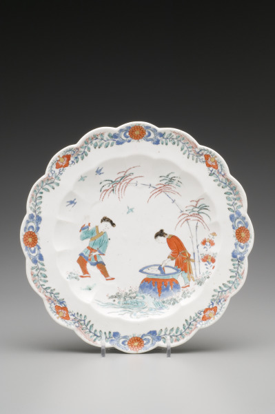 This plate is painted in the Japanese Kakiemon style with a scene known as “Hob in the Well.” It illustrates an 11th-century Chinese story in which a boy was rescued from drowning by the quick action of his friend, who broke the large cistern into which the boy had fallen.