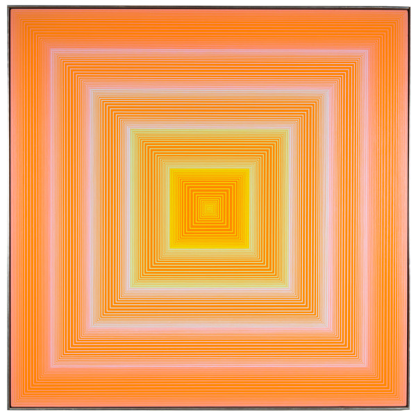 In the late 1960s, Richard Anuszkiewicz had come to be recognized as one of the leaders of the new “Op Art” movement, whose practitioners sought to fuse the dynamism of Abstract Expressionism with a sense of restraint and geometry, resulting in canvases whose interaction of color and line produced mesmerizing optical effects. Josef Albers, with whom Anuszkiewicz studied, was a major influence on these artists and their approach to color and form.