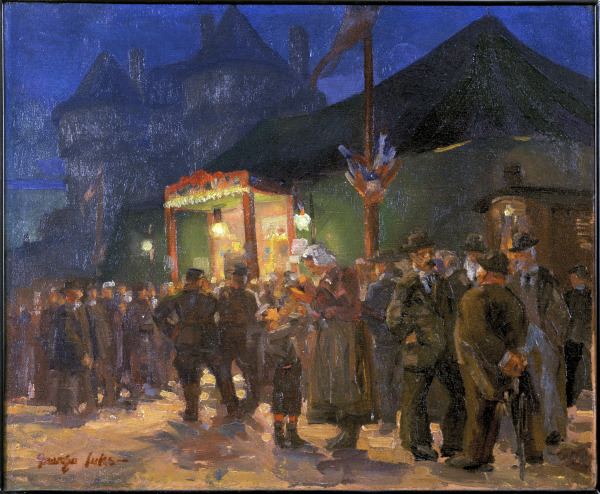 Like the other artists of the Ashcan School George Luks made a name for himself by creating paintings of the people and neighborhoods of lower Manhattan. Luks was, perhaps, the member of the group whose paintings of this subject matter were the most coarse and unflinching. He was known to have been lively and cantankerous, a drinker and a carouser who found the hardscrabble lives of immigrants and loners more stimulating than those of the upper classes. In 1918 Luks painted Blue Devils on Fifth Avenue, a scene of French veterans on parade in New York (now owned by the Phillips Collection in Washington, D.C.), for an exhibition of paintings in support of Allied efforts in World War I. The Mint Museum’s Carnival Scene, which includes figures clad in similar blue military garb as well as French flags, is likely a related work.