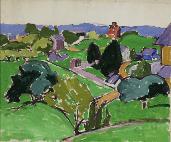 In the first few years of his career, Stuart Davis worked as an urban realist, creating paintings featuring straightforward representations of city life. Davis, however, was a constant experimenter and he hungrily absorbed virtually every new style that he encountered, from Post-Impressionism to Fauvism to Cubism. Town and Rolling Hills is part of a group of paintings in which Davis began to process the work of the Cubists, which he had seen at the Armory Exhibition of Modern Art in 1913 (an exhibit in which he, at the age of nineteen, had also participated). This painting’s flattened perspective, high horizon line, simplified forms, and bold colors and brushwork all attest to the powerful impact of Davis’s encounter with modern art. Over the next decade he refined and experimented with many of these elements as he developed his own mature abstract style.