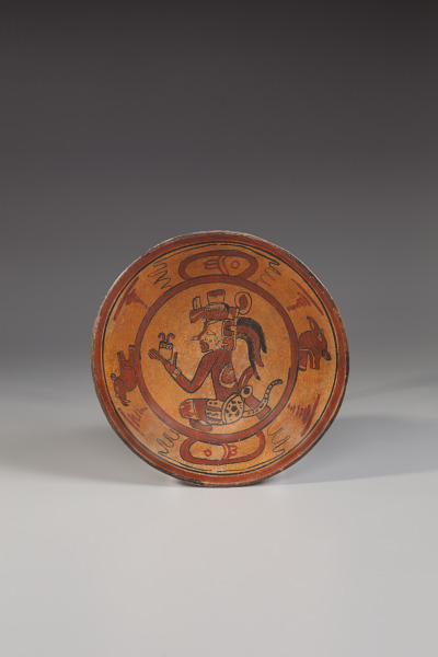 A Maya ruler, sitting in the position of royal authority, wears a jaguar pelt over-skirt. He holds aloft the ajaw symbol of regal authority, ajaw meaning “lord / speaker” in the many Mayan languages.
