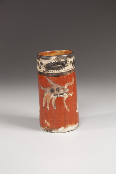 Some vases’ imagery refers to religious concepts and myths. This vase recounts a vignette from the Popol Vuh, a sacred text of the Maya that concerns the Hero Twins Hun Ajaw and Yax Balam. They were sacrificed by the lords of the Underworld who ground up their bones and threw the powder into the river. They miraculously reappeared as catfish, the spots on one of the fish identifying him as Hun Ajaw whose cheeks are characteristically marked with black dots.
