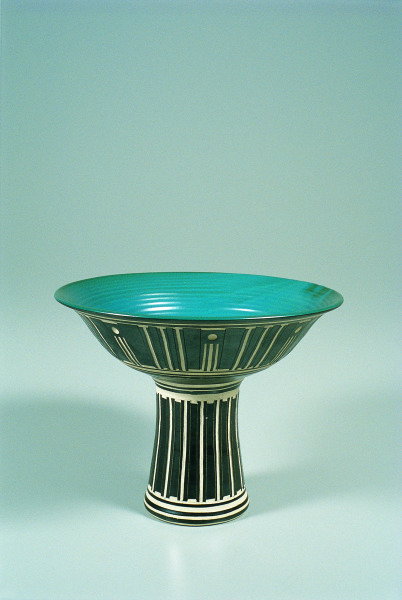 A master potter, Cohen first learned to throw on the potter’s wheel at the remarkably young age of six, and has continued to practice the craft throughout his life. As seen in this compote, or footed bowl, Cohen often adorns the surfaces of his pottery with intricate and complex abstract patterns, carved into the clay surface using a technique called sgraffito—decorative marks scratched or scraped to create textured areas upon the surface of the clay. The form is first allowed to reach a leatherhard state, by which the clay has dried enough to hold its shape, but still pliable enough to be responsive to changes imposed upon it. Next, Cohen applies a layer of black slip, or liquid clay, which he then allows to harden. Finally, he carves the pattern through the black layer, revealing the contrasting, lighter-colored clay beneath.