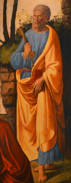 Saint Peter was one of the 12 disciplines of Christ and the first pope of the Catholic Church. He is traditionally seen holding a key or set of keys, a symbolic reference to the "keys to the kingdom of heaven" and the pope's authority over all things Catholic. Rosselli was one of several artists selected in the 15th century to paint the interior of the Sistine Chapel in Rome. Others included Sandro Botticelli, Pietro Perugino, Domenico Ghirlandaio followed by the great Michelangelo (his ceiling paintings date to 1508-1512). This painting was apparently part of an unidentified altarpiece that comprised several panels.