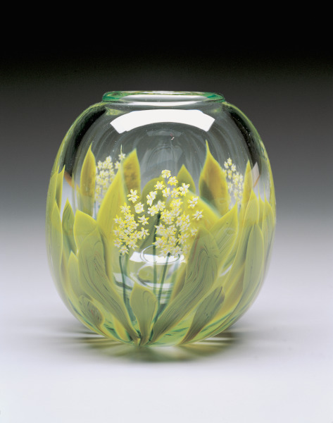 Lilies of the valley, which grow throughout Europe and North America, have long been prized for their sprays of small, sweetly scented, usually white flowers. Mark Peiser’s graceful rendering of them is the product of keen observation of nature and great technical skill. This vase comes from a series he called Paperweight Vases, made between 1976 and 1981, and inspired by the natural environment around his home and studio in Penland, North Carolina. To make them, Peiser used a torch to form glass canes into individual blossoms, stems, and leaves. He then painstakingly placed each part onto successive layers of hot glass. The act of inflating the glass enhanced the realism of the imagery, creating layers of depth as if one were surrounded by flowers. Peiser is renowned as a founding member of the studio glass movement; the Paperweight Vase series is one of several influential series he has produced. (Allure of Flowers)