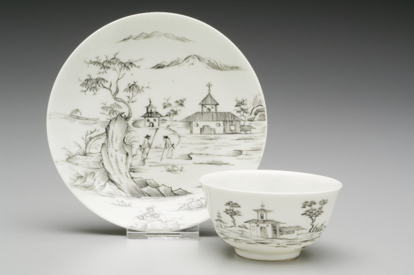 The monochrome decoration on this cup and saucer was drawn with a fine brush, a technique known as “penciling,” and it was unique to Worcester among English porcelain factories. Worcester derived the style from Chinese porcelain for the European market.