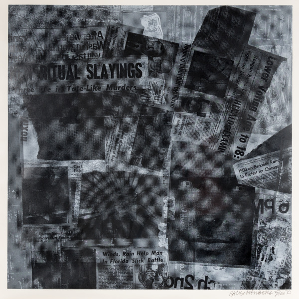 Rauschenberg’s "Surface Series" is one of four groups of screenprints that comprise his larger "Currents" series. Each print is a unique composition of headlines, texts, and photographs taken from the "New York Times, Los Angeles Times," and other major U.S. newspapers. The thirty-six original collages assembled by Rauschenberg as the original source for the editioned prints were eventually reproduced in a monumental fifty-four foot long print also entitled "Currents." The Mint Museum’s permanent collection includes seventeen screenprints from the "Surface Series."