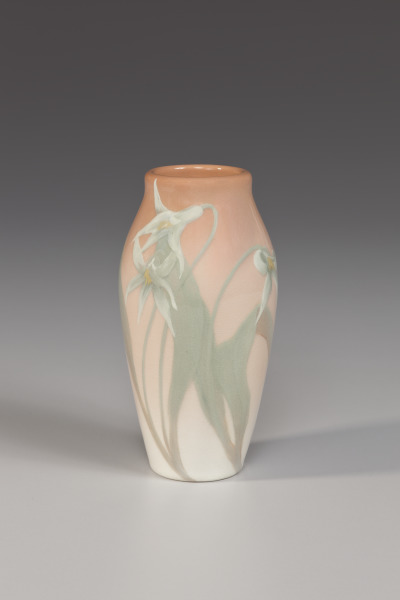 The flowers depicted here by Harriet Elizabeth Wilcox are probably white trout lilies, which are a native wildflower in Cincinnati, blooming in March and April, and may well have been drawn from life. In Wilcox’s image, the lily stems and leaves curve sinuously around the vase’s form, and the palette is made up of complementary colors appropriate to spring: soft green, white, and yellow against a pastel background that gently shades from lighter to darker peach. Wilcox’s composition is coated in Iris glaze, a crystal clear glaze often used on ceramics with pale color schemes. Iris was so named because Rookwood’s glaze designers believed it matched the sheen of the iris plant and was well suited for depictions of it; it was also used with other flowers. (Allure of Flowers)