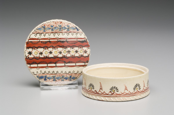 Small covered boxes like this could have been used for snuff, pins, or a cream or powder used at the dressing table. The lid’s painted decoration was probably inspired by a textile pattern.