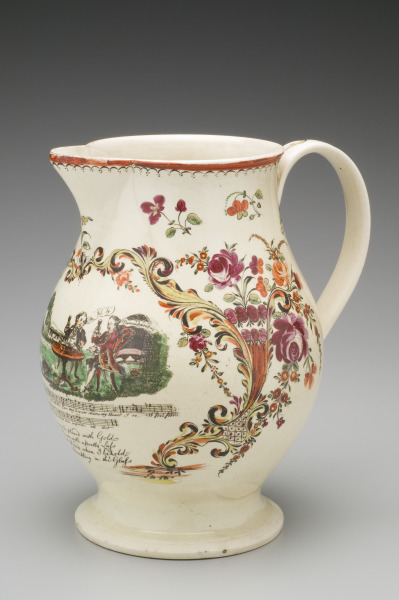 This large jug for beer or cider is transfer-printed with an image of two men drinking from a punch bowl and singing a song that begins: “The jolly bowl does glad my soul, the flowing liquor cheers my heart: I’ll revel free from all control, ‘tis this that does improve all art.”