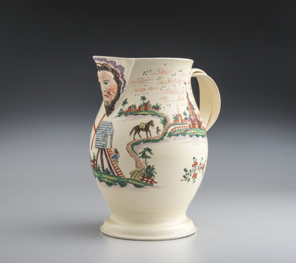 Notice the strikingly dissimilar images on this jug: on one side a Chinese woman stands in a garden; on the other side a man leads his horse along a winding road; and under the jug’s mask-shaped spout another man climbs a ladder to a windmill. It is impossible to know what motivated the enameller to paint such unrelated scenes—perhaps to demonstrate his versatility, or satisfy a customer’s request, or for yet another reason.
