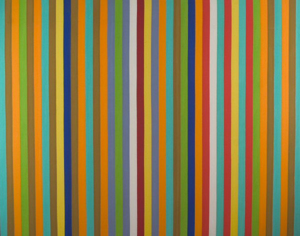 A member of the group known as the “Washington Color School,” Gene Davis created hard-edged geometric paintings that explore “color intervals,” or the rhythmic effects caused by the irregular appearance of colors within a composition. "Jack-in-Box" is comprised of uniform stripes of color that animate the canvas through a complex yet harmonious arrangement. Davis encourages viewers to enter his paintings by selecting a specific color and observing how it operates across the painting. “Approached this way,” Davis states, “something happens…one must enter the painting through the door of a single color. And then, you can understand what my painting is all about.”