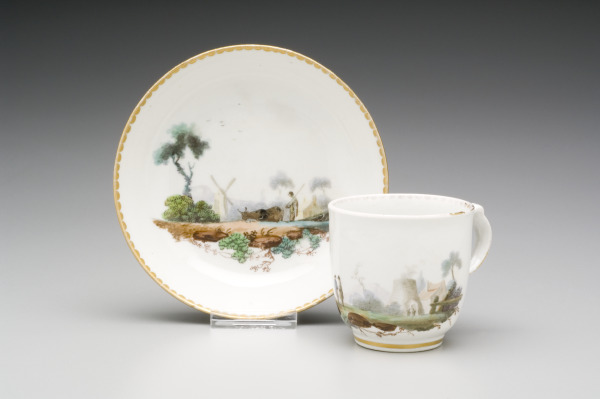 This cup and saucer were decorated by Fidelle Duvivier. Born in Tournai, Duvivier was a highly skilled porcelain painter whose career included stints at Derby, the London decorating studio of James Giles (1718–1780), the Sceaux factory near Paris, and the Loosdrecht manufactory in the Netherlands.