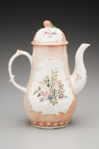 The coffeepot’s reserves (the surface areas left without the peach ground color) are painted with loose floral bouquets centered around a large, wilting rose. This motif is distinctive to Longton Hall and West Pans wares, and collectors have often assigned it to the alleged “Trembly Rose Painter.” The artist’s identity has never been determined, however, and it is more likely that the prolific bouquets are the work of more than one painter.