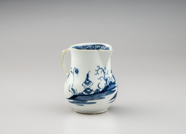 This jug is painted with a mock Chinese scene known as the “crossed-fence” pattern. Longton Hall’s blue-and-white decoration is usually of Chinese inspiration, and the factory produced as many as forty such designs. The “crossed-fence” pattern may be particular to Longton Hall only.