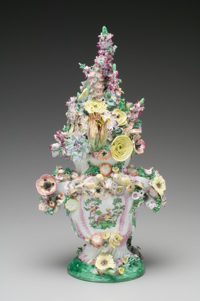 This elaborate vase held potpourri. The lid is pierced, but its holes are hidden by the profusion of applied flowers, presumably in order to heighten the verisimilitude for the viewer, who would detect a floral fragrance emanating from the vase without being aware of the potpourri within.