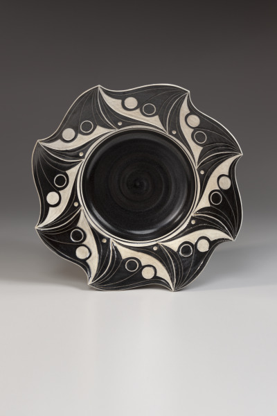 Born on the Lower East Side of Manhattan, Cohen first learned to throw on the potter’s wheel at the remarkably young age of six, and has continued to practice the craft throughout his life. After earning his MFA from the prestigious New York State College of Ceramics at Alfred University, Cohen worked as a designer for Hyalyn Porcelain Company in Hickory, North Carolina. In the 1970s he moved to Blowing Rock, North Carolina to establish his own studio, but returned to Charlotte in 2010, where he remains active in the local arts community. Created during his early years in Blowing Rock, this platter is an excellent example of Cohen’s expressive sgraffito work, the contrasting circle and wave-like pattern repeated around the rim accentuated by the carved edges of the platter.