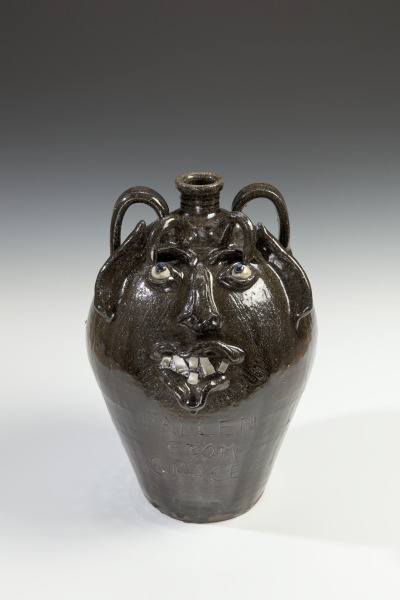 After graduating from Appalachian State University, Charlie Lisk worked for Pinehurst Pottery in Moore County before moving to Vale, where he met Burlon Craig. Influenced by Craig, Lisk began to fire with a wood kiln, adopted ash glazes, and began to make swirlware. Lisk is also known for his expressive face jugs. This example has the inscriptions “Fallen from Grace” on its front and “The Devil Was Cast Out from Heaven” on its back.