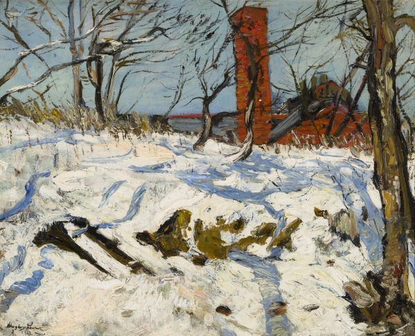 Each of these canvases offers a distinctive view of New York City. Max Kuehne’s painting depicts the lower tip of Manhattan as seen from the dockyards of Brooklyn while Hayley Lever (in a canvas completed during his first year in New York) offers a unique worm’s eye view up a steep cliff, which is surmounted by an industrial building, near the George Washington Bridge on the northern part of the island. While neither of these artists is considered an official part of Henri’s inner circle, both were close associates of its members and both were clearly influenced by Henri’s advice to his students to seek their subject matter in the everyday life of their urban surroundings.
