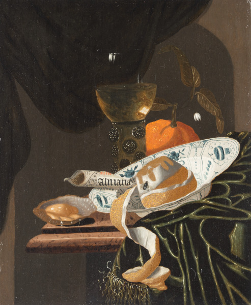 Seventeen paintings by Martinus Nellius survive and are dated between 1673 and 1694, although others are attributed to his hand or bear his influence. His work often depicts simple compositions with fruit, flowers, shellfish, an insect or two, and glass objects - such as an exquisite glass goblet, or Roemer. Here, the depiction of a blue and white porcelain bowl presents a form of Asian ceramics known as Wanli Kraak,; which were among the first Chinese wares to reach Europe in the early 17th century.