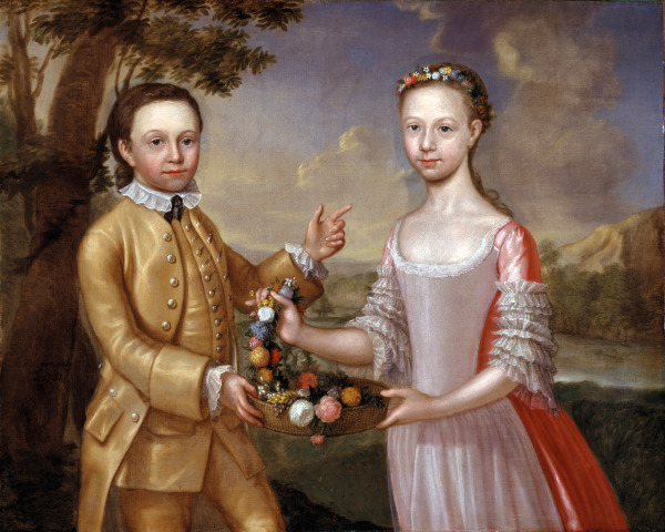 The portrait of two young children is signed and dated by Cosmo Alexander, an itinerant Scottish portrait artist who worked in the American colonies in the late 1700s. The date on the painting (1761) suggests it was made before he came to this country. But if we compare it to one of his later, “American” canvases, like the "Portrait of a Lady" attributed to him that hangs nearby, we can see that he worked in roughly the same style on both sides of the Atlantic. While in America, Alexander met and eventually became a mentor to Gilbert Stuart, whose portrait of Isaac Gouverneur hangs nearby.