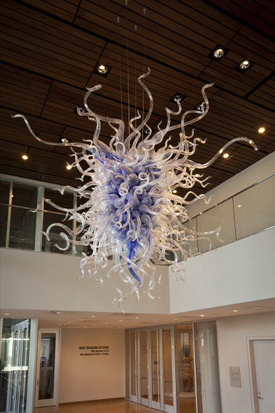 Dale Chihuly’s popularity as a glass artist is unmatched. His vessels, sculpture, chandeliers and dramatic installations have captivated audiences worldwide. Chihuly’s work characteristically exhibits a fluidity, delicacy, and extravagance. Royal Blue Mint Chandelier embodies these classic elements. This suspended organic structure with its radiating tendrils contains approximately 318 hand-blown clear and blue glass pieces.