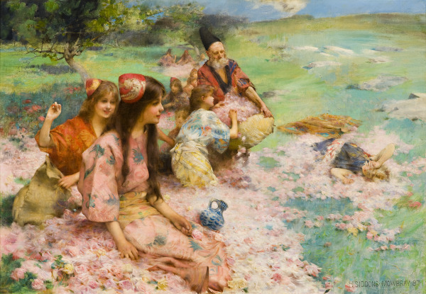 During the final quarter of the 19th century an increasing number of international fairs and expositions that showcased cultures and goods from around the world piqued Americans’ interest in the near and far East. Mowbray’s painting, which was included in the 1893 Columbian Exposition in Chicago, exemplifies this trend, as do the large vase inspired by Moorish designs and the fancy dress costume gown nearby. Mowbray’s painting illustrates a scene from Irish poet Thomas Moore’s epic romance, Lalla Rookh, in which a group of young maidens prepare for their princess’ passage after her marriage. Originally published in 1817, Moore’s poem was republished during the 1880s to much critical and popular acclaim. Although at first glance Mowbray’s painting seems to represent little more than a dreamy scene, it also exemplifies some of the era’s stereotypical views about Eastern cultures as lazy and exotic.