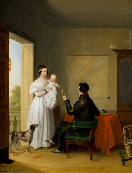 James Clonney specialized in genre painting, a form of art in which the primary subject was everyday life. Clonney’s attention to narrative details, as seen in this work, became a hallmark of his highly popular style. On a basic level, the subject matter of the painting reflects a widespread Victorian interest with roses in 19th century American and British cultures. As Queen Victoria’s most prized flower, the rose and its cultivation took center stage in mid-19th century horticultural writings. Although the exact symbolic nature of the gesture of offering a rose to a baby is uncertain, it may suggest the father’s desire to pass along virtue and purity—two of the common meanings of the flower—to his child.