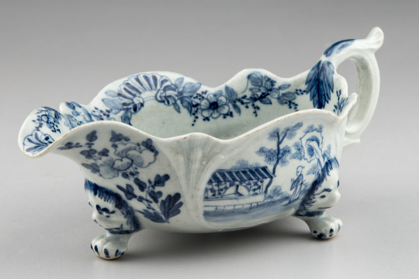 This molded sauceboat, with its wavy rim and lion’s mask-and-paw feet, is based on an English silver form, while its painted decoration includes Chinese-inspired motifs.