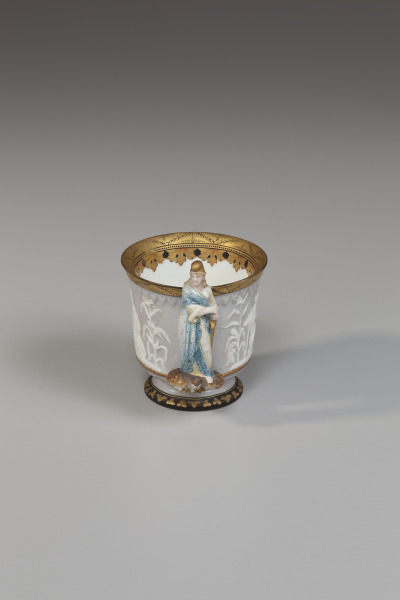 This cup was designed for exhibition at the Philadelphia Centennial Exposition of 1876. The patriotic decoration includes the figure of Liberty standing on an American eagle, which forms the handle. On the body of the cup appear the figures of Justice and Hermes, the god of commerce. These figures are flanked by the cornstalk of the North and the cotton plant of the South, symbols of the bounty of America, a favored theme of the period.