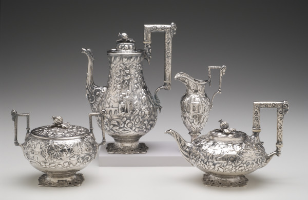 Samuel Kirk was the best known and most important silversmith in the mid-Atlantic region in the 19th century. By 1828, work from his firm accounted for 93% of the fine silver produced in Baltimore. Kirk was celebrated not only for the purity of the silver that he used, but for his skillful repoussé work as well. Repoussé is a French term that literally means “pushed from behind”; all of the patterns on the bodies of the vessels in this tea set have literally been hammered out from the back, making the decoration stand in relief upon their surfaces.
