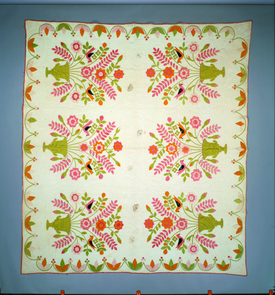 Classic floral appliqué quilts of the 1850s and 1860s differ slightly from region to region and among different ethnic communities. The arrangement of this Birds and Butterflies Quilt reflects the coverlet designs from southeastern Pennsylvania, which were woven on a jacquard loom by itinerant male weavers. The pair of birds depicted in this quilt was also a common element used on Pennsylvania German painted furniture.