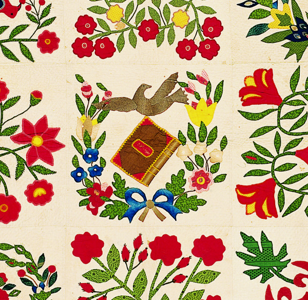 Album quilts originated in the 1840s in Baltimore, at that time the second-largest and one of the most prosperous cities in the United States. Until the Civil War, Baltimore album quilts were not made with scraps, as most quilts were and still are today, but rather with new fabric. This example was made by Catherine Bell Hooper, the wife of a prominent mill owner. The Bible in the center block is embroidered with Catherine’s initials; the other twenty-four blocks are a riot of colorful, stylized blossoms in a variety of arrangements. The flowers in bouquets, baskets, wreaths, and loose groupings are not readily identifiable as specific species, but instead allude to the wealth of blooms available in a prosperous Baltimore garden. The wide border of red-and-green bows and swags is a classic color combination of the 1850s. (Allure of Flowers) Baltimore Album quilts are regarded as the height of mid-19th century appliqué quilts. Techniques, fabrics, and pictorial images infuse these quilts with their distinctly Baltimore flavor. Layered baskets and vases overflow with multi-colored flowers, while pictorial blocks include Baltimore monuments and buildings as well as prominent citizens and war heroes. A talented and well-known quilter of the period, Catherine Bell Hooper (1813-1881) made this Baltimore Album Quilt. In 1833, she married William Hooper, the founder of an important cotton textile mill named Mount Vernon Mills. Accordingly, Hooper had a ready, available source for her materials. In this quilt, the center block features a Bible with Catherine Hooper's initials embroidered in yellow. There are no other names inscribed on the quilt and the fabrics remain consistent throughout most of the blocks, a typical indication that the quilt was made by one person. (Bresler)