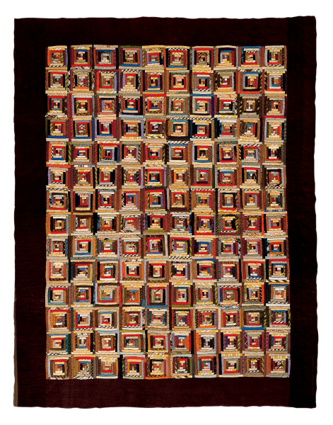 The number and size of the pieces that compose this quilt are astounding. The center field is filled with tiny Nine-Patch pieced blocks surrounded by multiple borders and even smaller patches. The quilt contains maroon, navy, red, pink, and black dress prints popular in the last decade of the 19th century.
